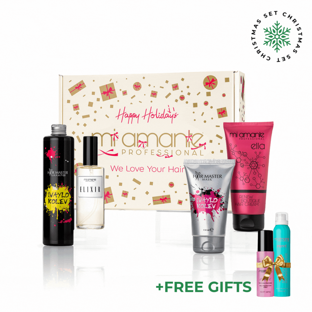 Sada kompletná starostlivosť o vlasy Ivaylo Kolev a Mi Amante, ktorá obsahuje Šampón a Masku od stylistu Ivaylo Kolev a Krém Ella a Elixír od Mi Amante Professional za špeciálnu cenu.