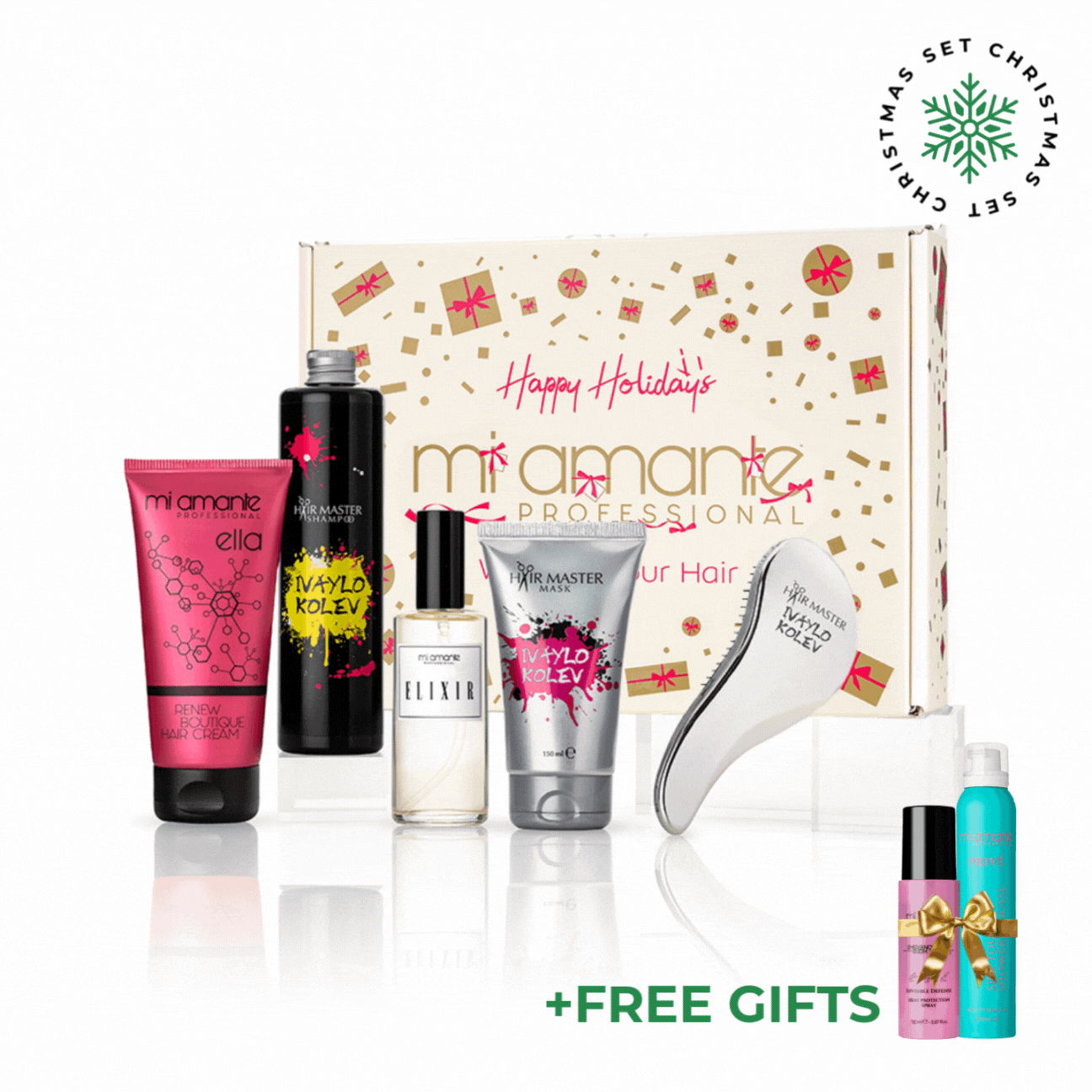 Sada kompletná starostlivosť o vlasy Ivaylo Kolev a Mi Amante, ktorá obsahuje Šampón a Masku od stylistu Ivaylo Kolev a Krém Ella a Elixír od Mi Amante Professional za špeciálnu cenu.
